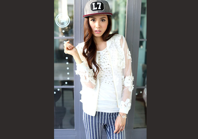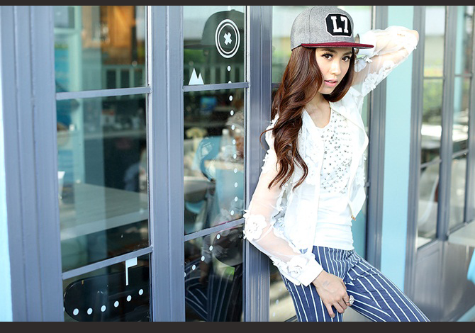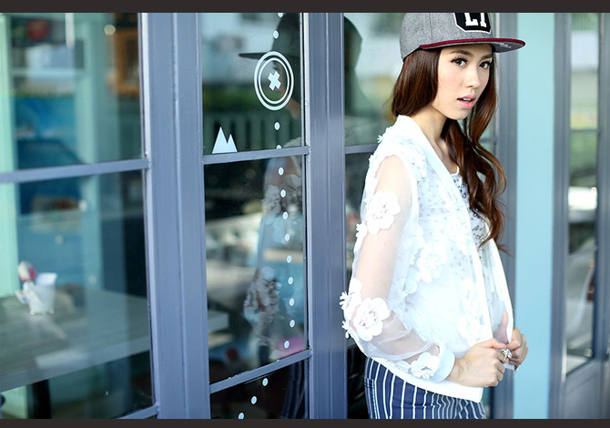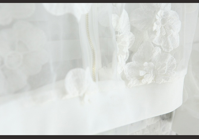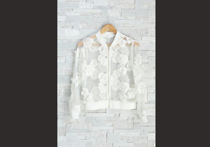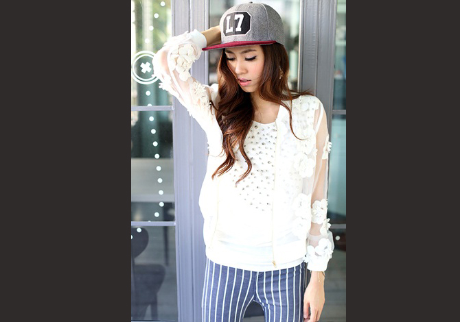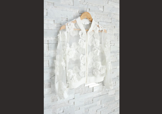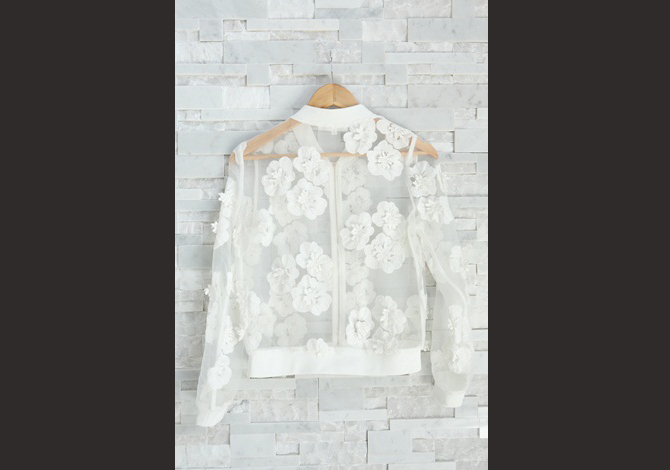เสื้อแจ๊กเก็ตซีทรูสีขาวสวย ประดับดอกไม้ดอกใหญ่ๆ รอบตัว งานเกาหลีเกรดดีม๊ากกก ผ้าใส่สบาย แมทช์ได้หลายอย่าง pattern เป๊ะตัวนี้ Exclusive สุดๆ ค่ะ