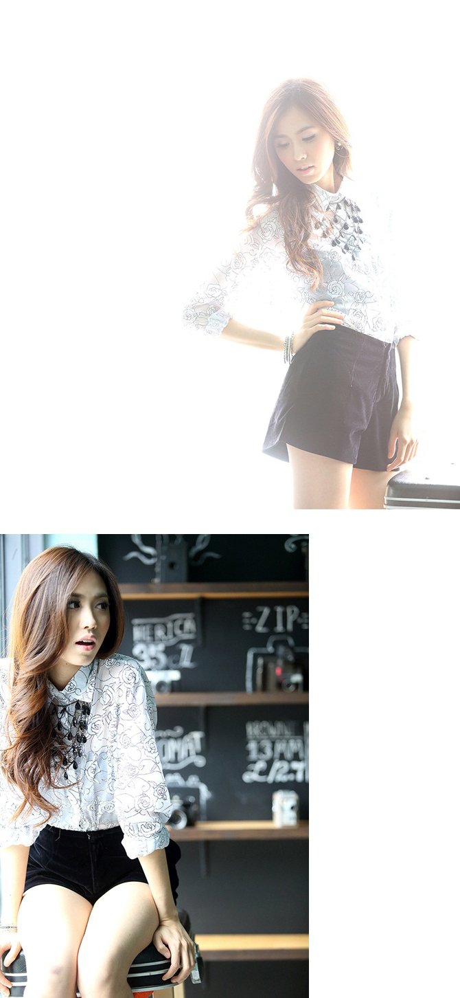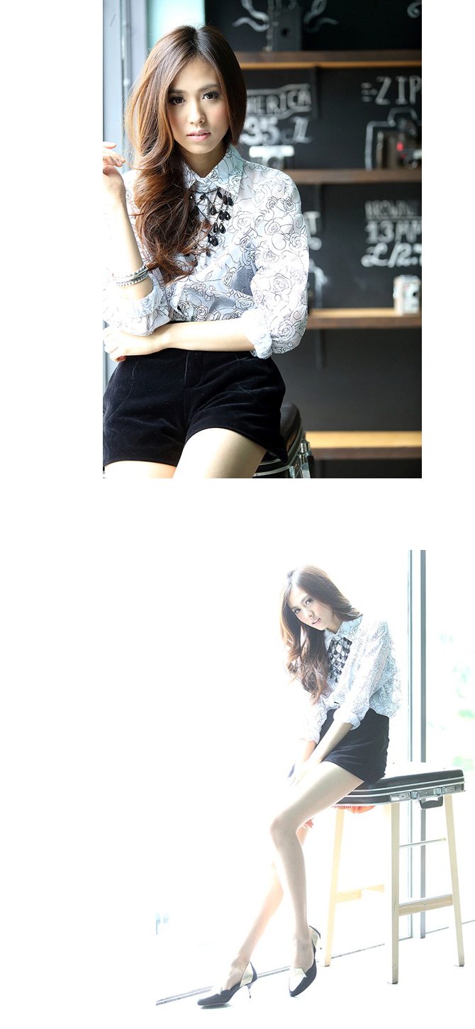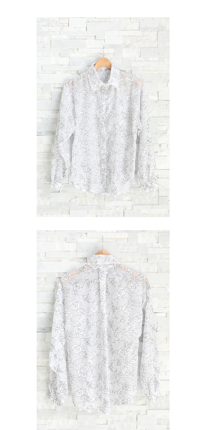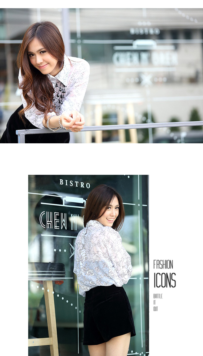 เสื้อเชิ้ตผ้าชีฟองพิมพ์ลายกุหลาบในตัว เนื้อผ้าลื่น.ใส่สบาย ปลายแขนจั้มพ์เล็กๆ จะใส่ปล่อยแขน หรือ พับแขนขึ้นก็สวยค่ะ Must Have Item นะคะ