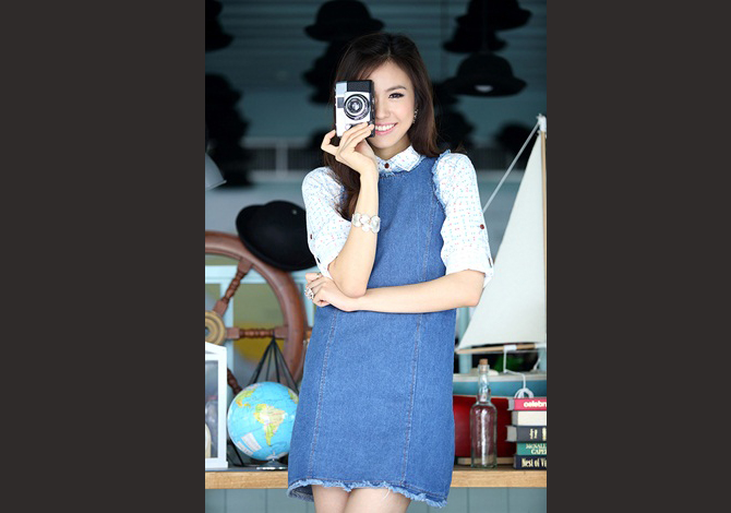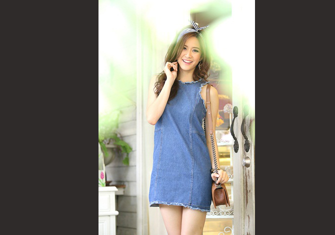 เดรสยีนส์ทรงสวย ปลายบานเล็กน้อย แต่งรุ่ยที่ช่วงแขนและชายกระโปรงแบบซิ่งๆ งานซิปหลังใส่สบาย ตัวนี้เปรี้ยวมากๆ ค่ะ