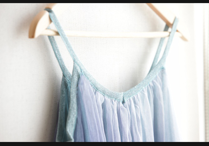 - เสื้อกล้ามสายเดี่ยวตัวนี้น่ารักมากกกกก ผ้าชีฟองแก้วไล่เฉดสี มีซับสีฟ้าเข้ากัน กุ้นขอบไหมพรมวิ้งๆๆ เอาเป็นว่าใส่ออกไปเที่ยวกี่ทีคนก้อชมทีเดียว