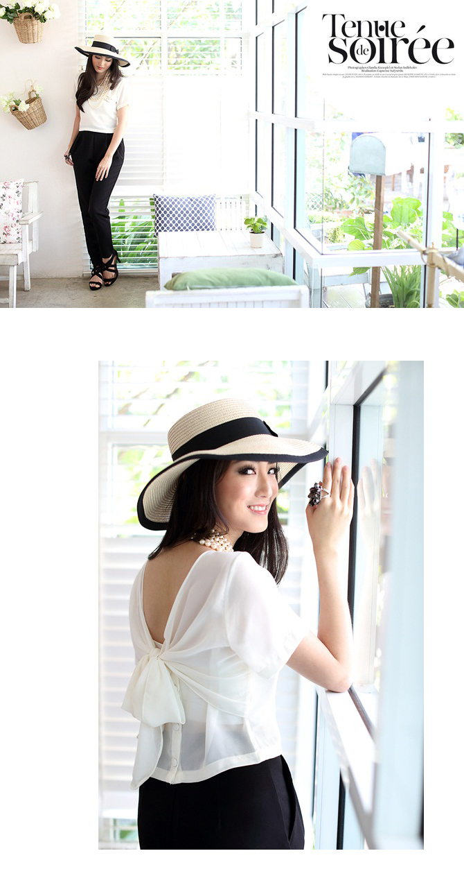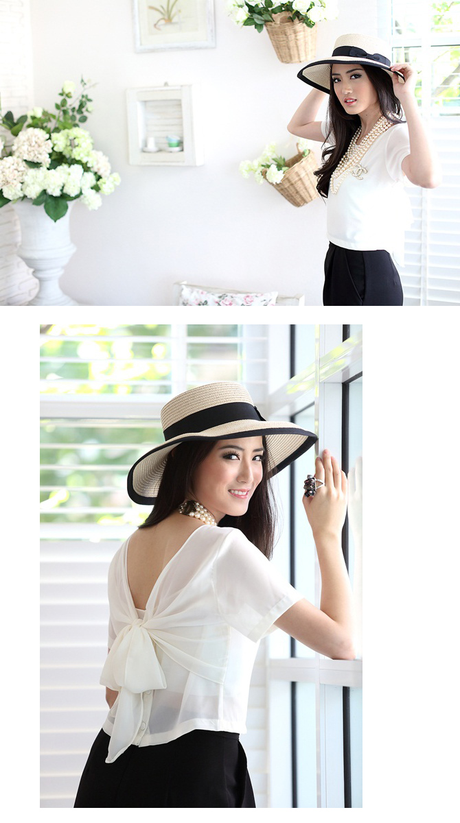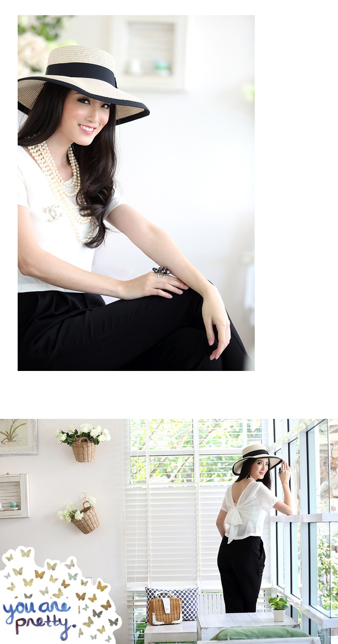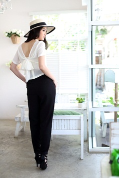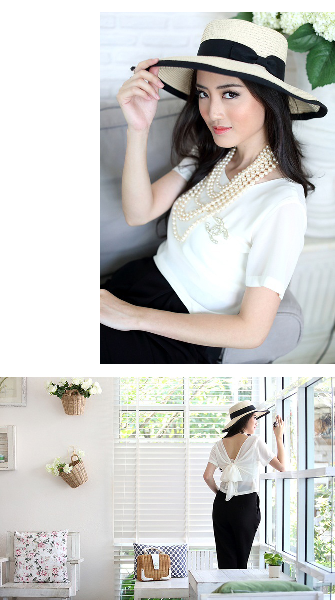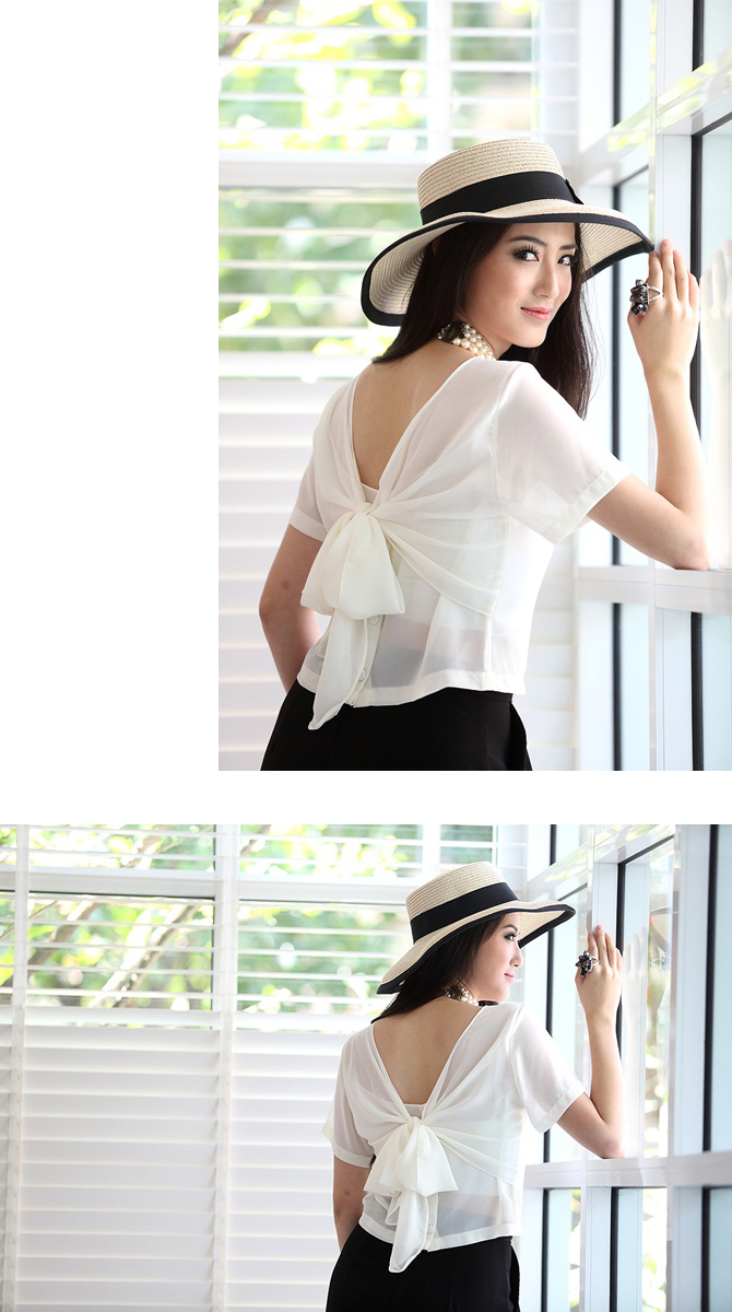 เสื้อแบบเก๋ ทรงคร๊อปเล็กๆ แถมด้านหลังมีโบว์ให้ผูกเก๋ไก๋ หวานซ่อนเปรี้ยวตามกระแส สาวเกาหลีได้อีกค่า แนะนำสาวๆ แมทช์กับเอวสูงแล้วสวยเปรี้ยวอย่าบอกใครเลยนะคะ Pre Summer นี้ ถือเป็น Must Have Item เลยค่า