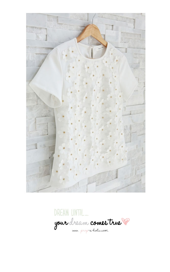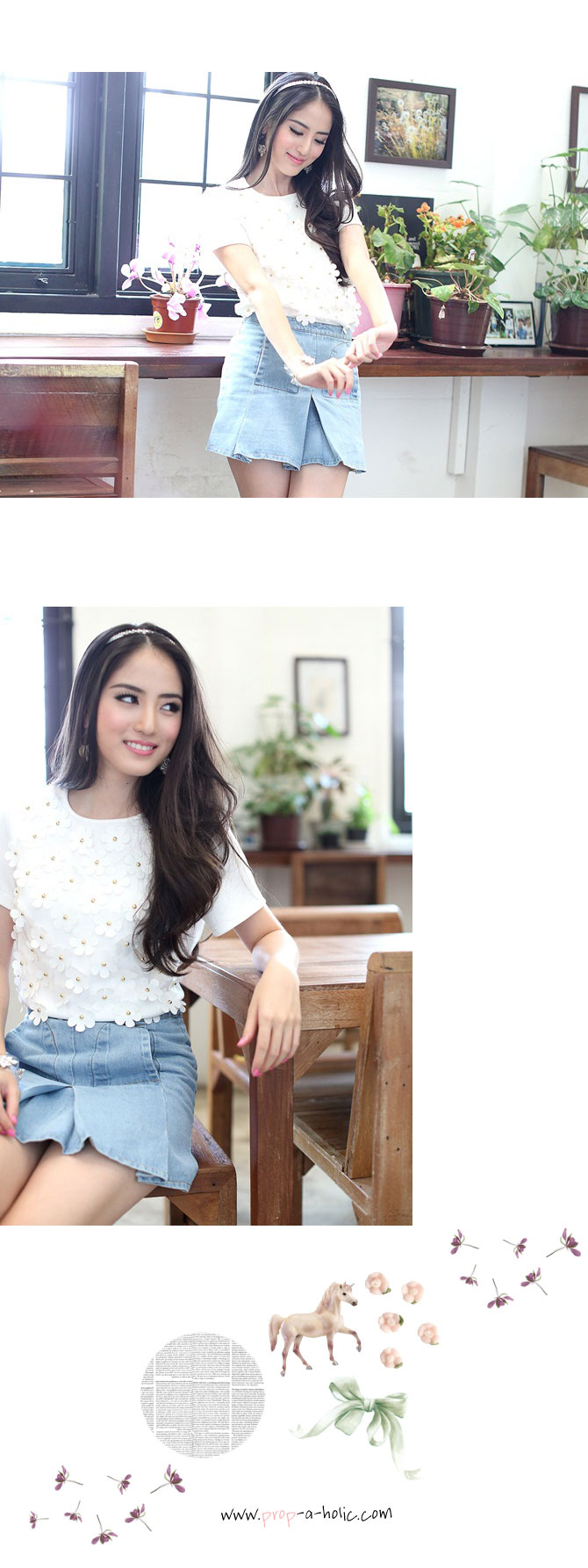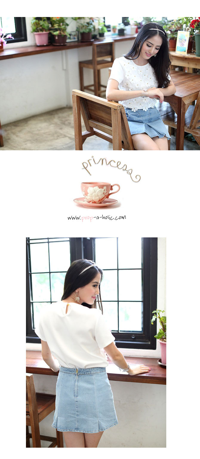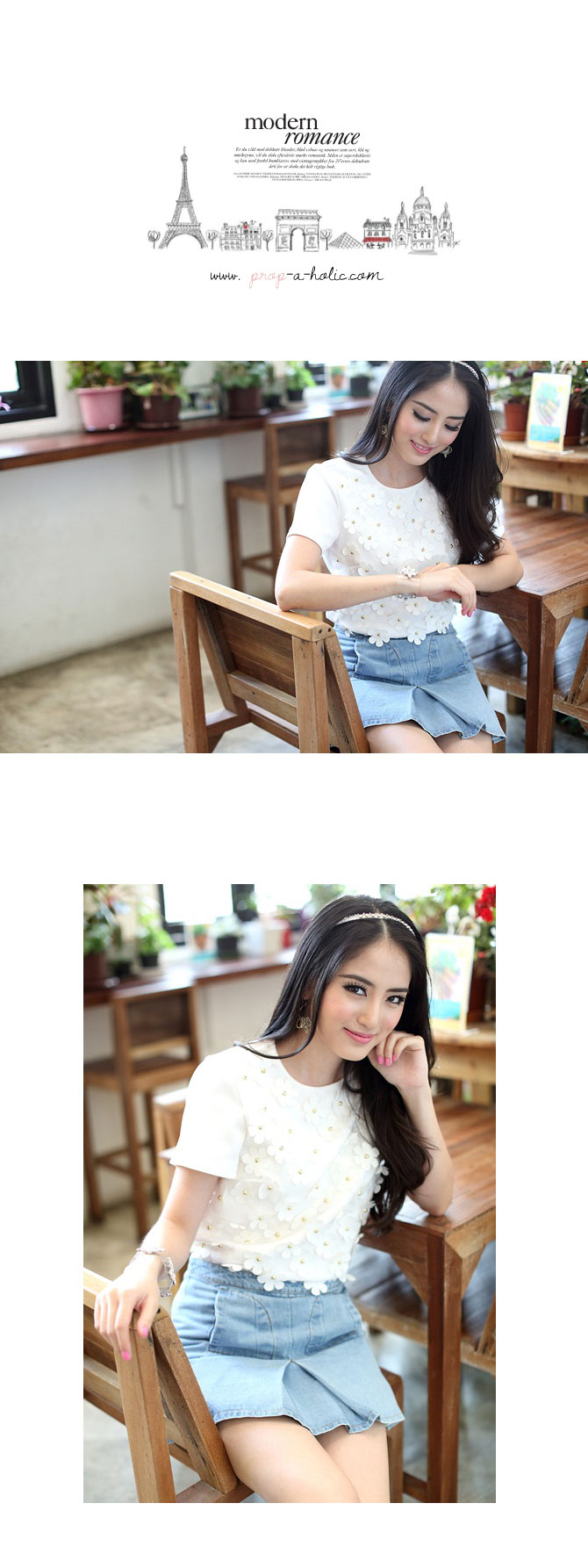 เสื้อผ้าชีฟองผสมเนื้อหนา ไม่บางไม่เนื้อผ้ายืดหยุ่นได้สบายตัว ทรงสบายๆ งานเกาหลีอินเทรนด์อีกตัวที่อยากแนะนำค่ะ ช่วงตัวประดับดอกไม้สไตล์ไฮแบรนด์ด้านหน้าตลอดตัว เพิ่มลุกส์ ดูหรูหรา มีราคา น่ารักมาก แมทช์คู่กระโปรงยีนส์รายการ ST335 ก็ดูคาวาอี้นะคะ