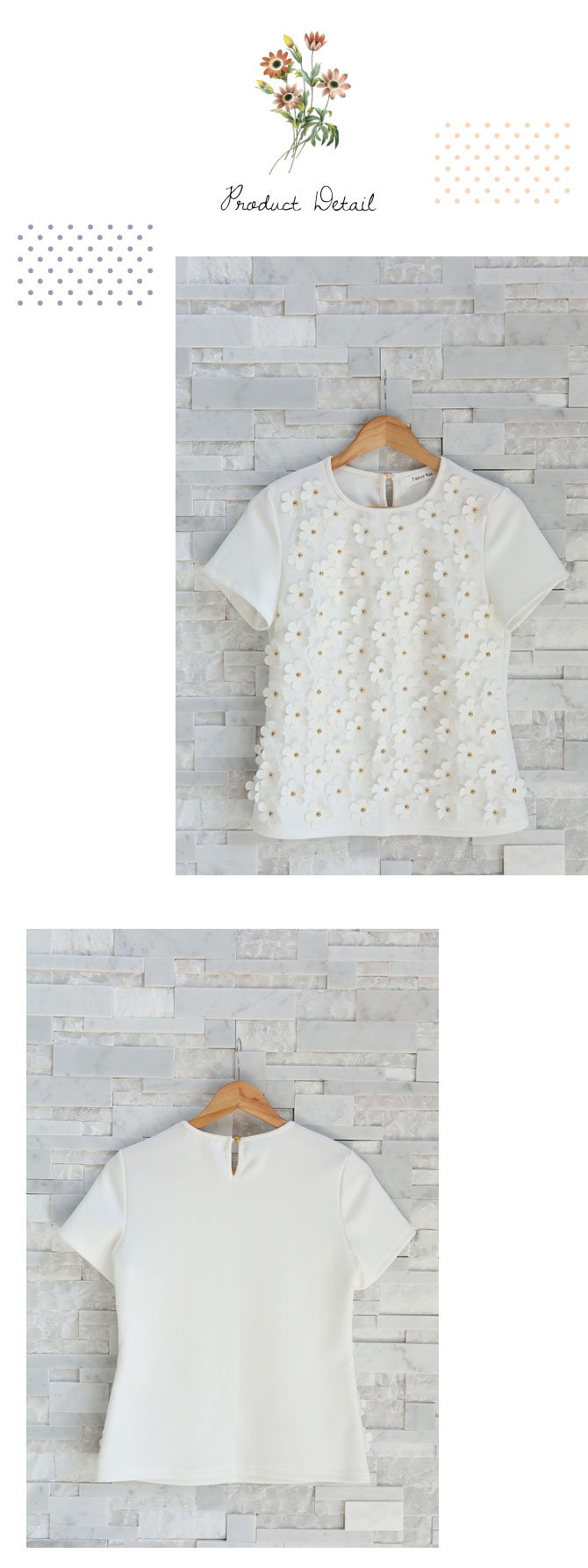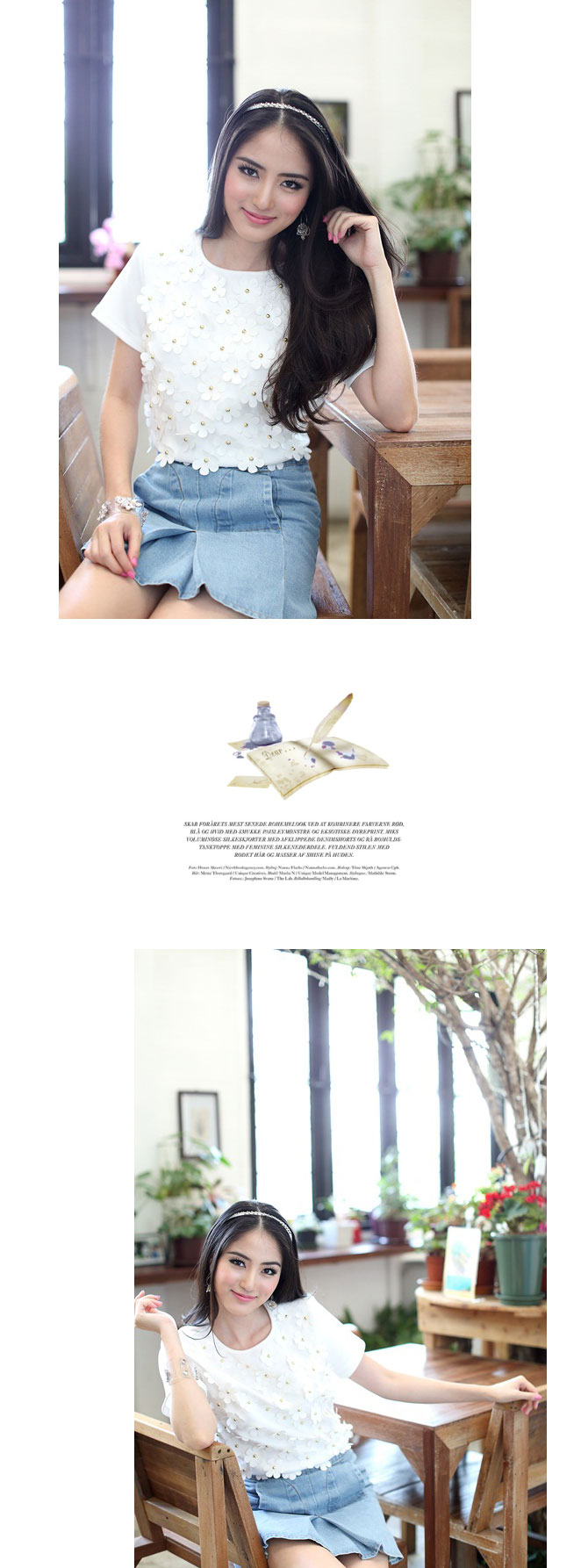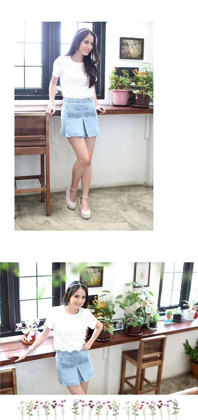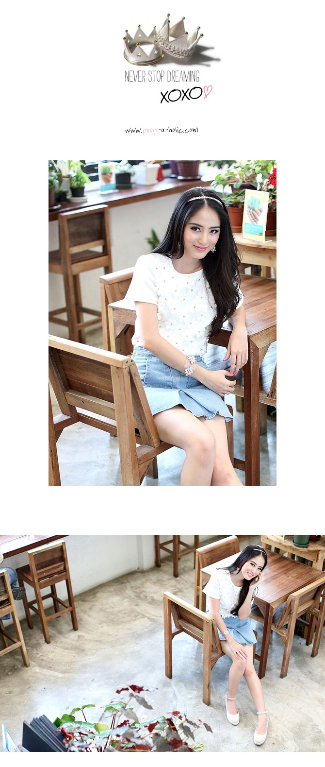 เสื้อผ้าชีฟองผสมเนื้อหนา ไม่บางไม่เนื้อผ้ายืดหยุ่นได้สบายตัว ทรงสบายๆ งานเกาหลีอินเทรนด์อีกตัวที่อยากแนะนำค่ะ ช่วงตัวประดับดอกไม้สไตล์ไฮแบรนด์ด้านหน้าตลอดตัว เพิ่มลุกส์ ดูหรูหรา มีราคา น่ารักมาก แมทช์คู่กระโปรงยีนส์รายการ ST335 ก็ดูคาวาอี้นะคะ
