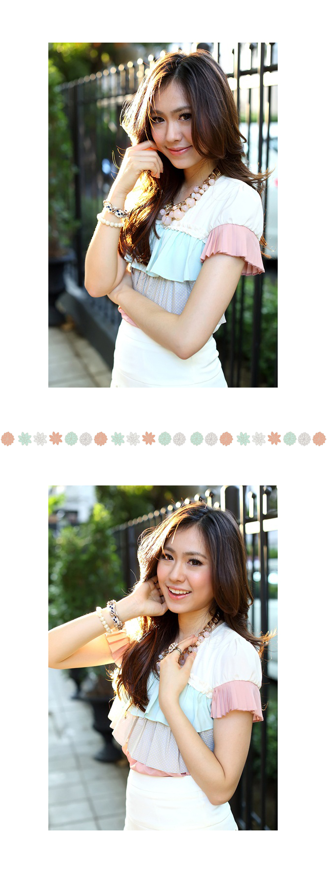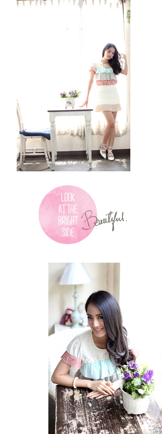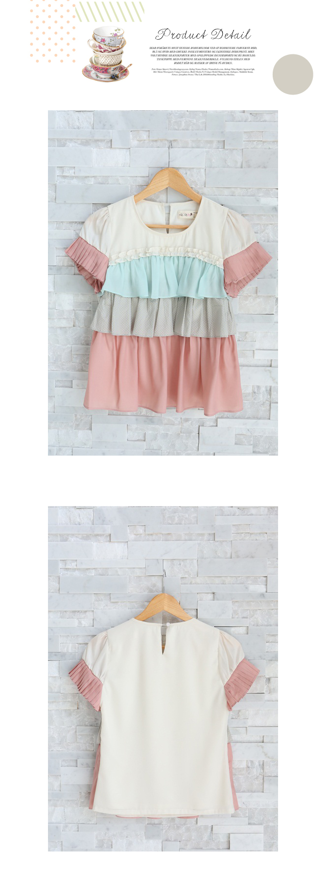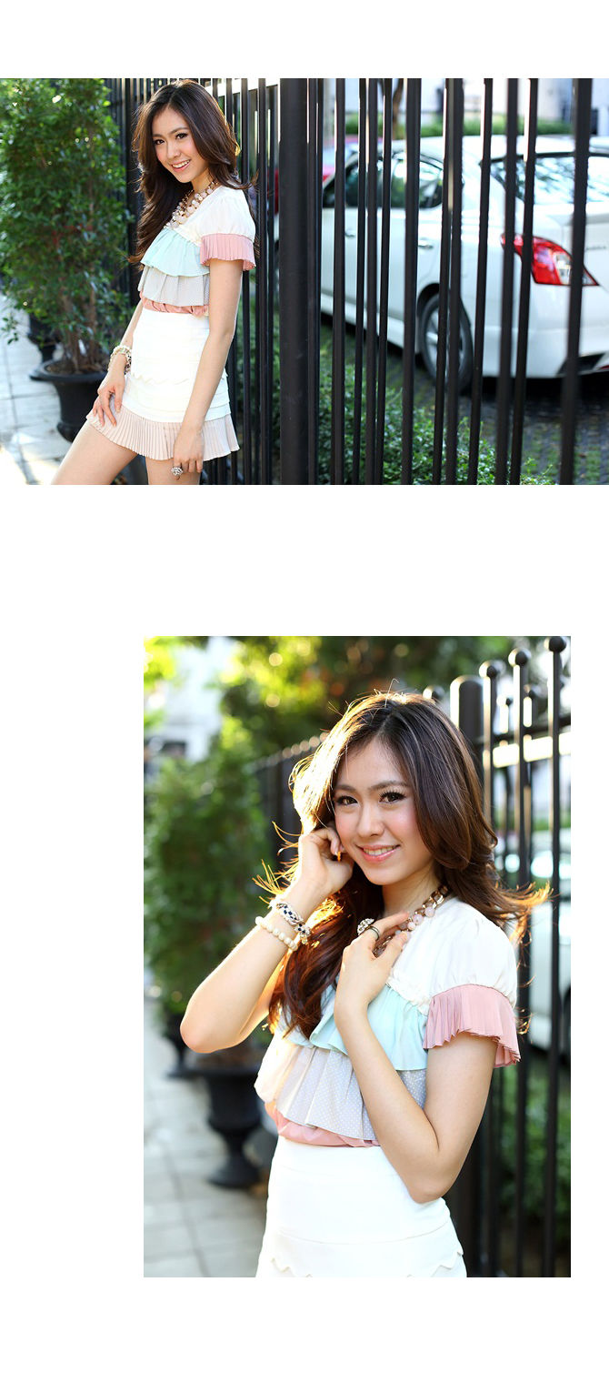 - เสื้อแบบหวานๆ งานเก๋ๆ ตัวนี้ทรงใส่ง่ายสบายๆ แต่มองแล้วแจ่มว้าวววที่สีสุดเดิ้น สาวกพาสเทลมีกรี๊ดดดแน่นอน กับความลงตัวของระบายไล่สี จับพลีตอย่างดีที่ช่วงแขน มองแล้วน่ารักมากๆ ค่ะ แมทช์กับกระโปรงรายการ 3-ST319ก็ได้ลุกส์คุณหนูจัดๆ เลยจ้า La Rami การันตีคุณภาพความเนี๊ยบค่ะ