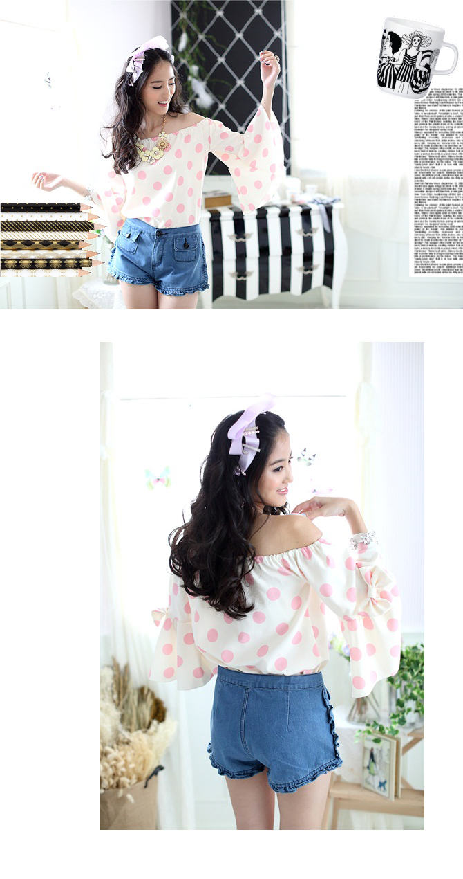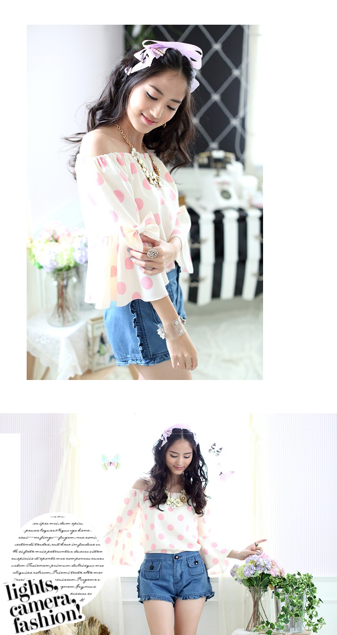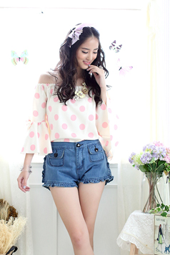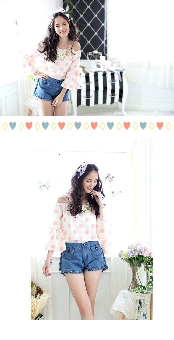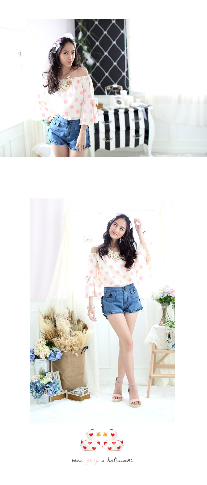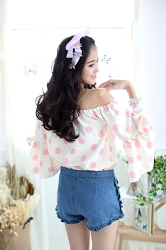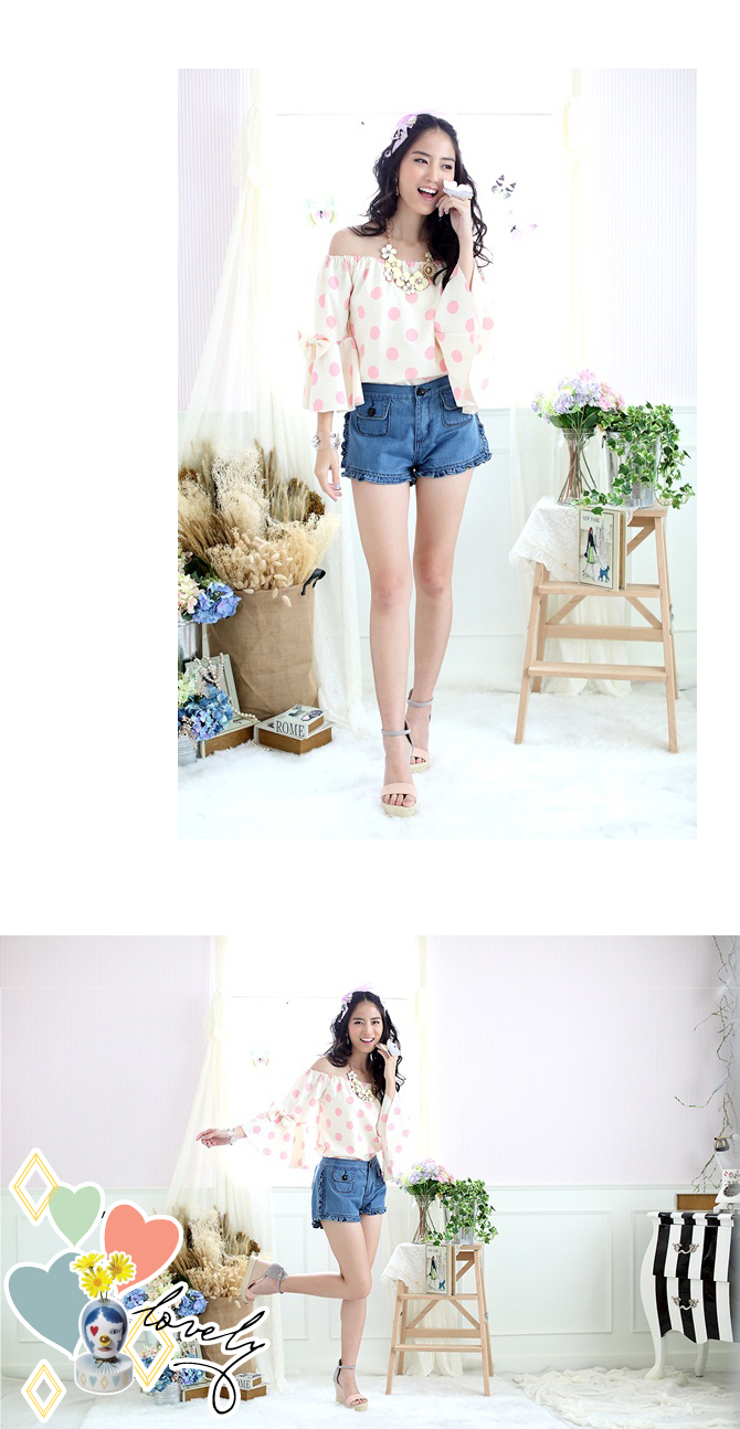 - เสื้อเปิดไหล่ สีหวานน่ารัก ตัวนี้ดีไซน์น่ารักสุดๆ ทั้งสีสันและลายดอท เข้ากันม๊ากมาก ช่วงปลายแขนทำเก๋ด้วยปลายระฆัง เนื้อผ้าลื่นๆ เย็นๆ ใส่สบาย มาพร้อมยางยืดช่วงคอ ใส่เปิดไหล่ก็เซ็กซี่เล็กๆ หรือยกไหล่ขึ้นเล็กน้อยก็ดูเก๋ไก๋ค่ะ คอนเฟิมด้วยดีเทลแน่นขนาดนี้ ไม่มีติดตู้ไว้ รับรองว่าต้องเสียใจแน่ๆ ค่า