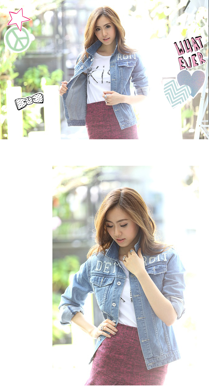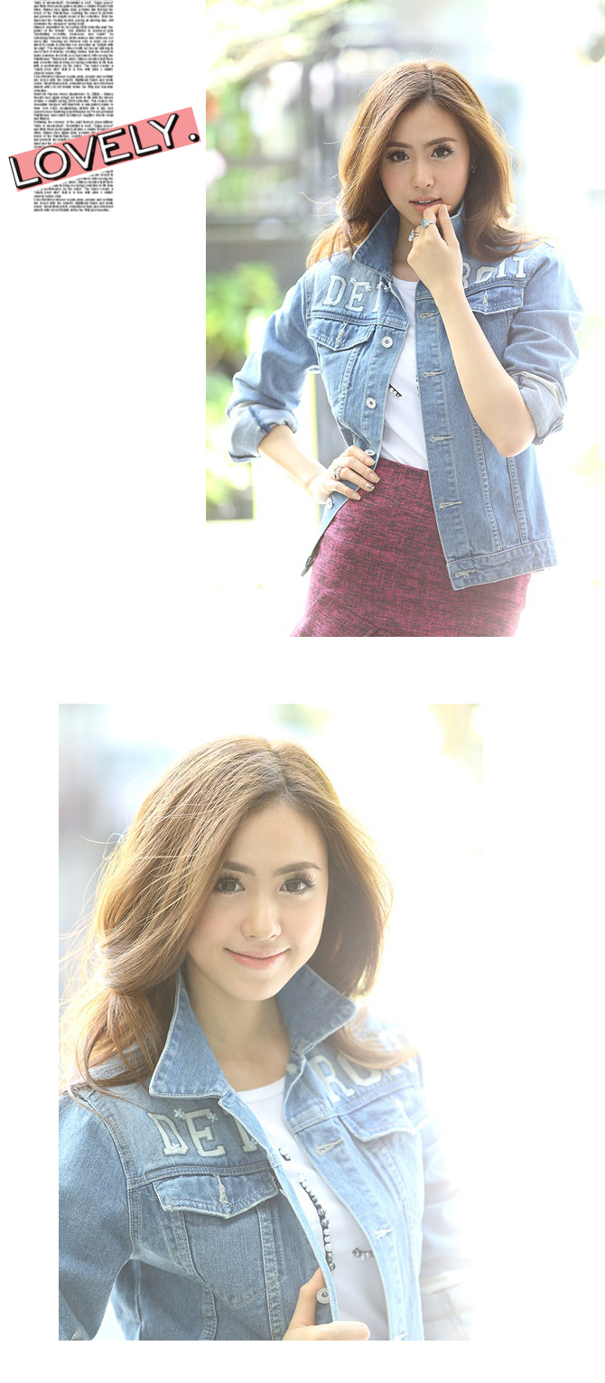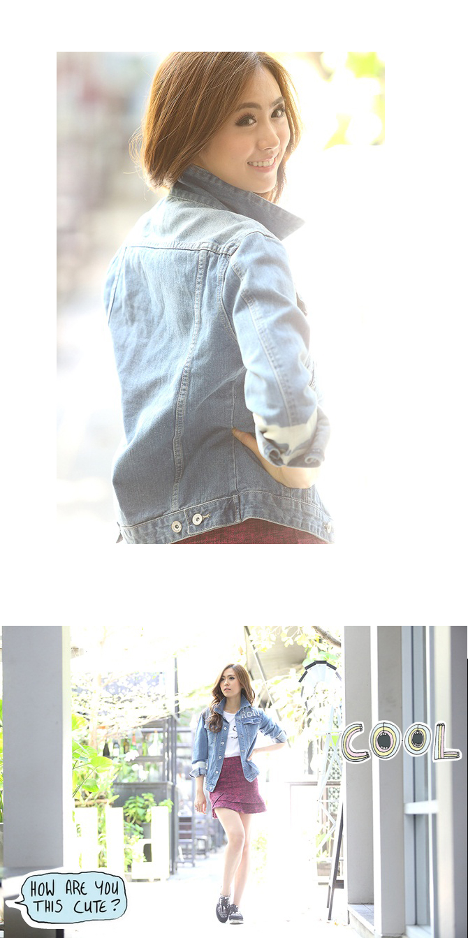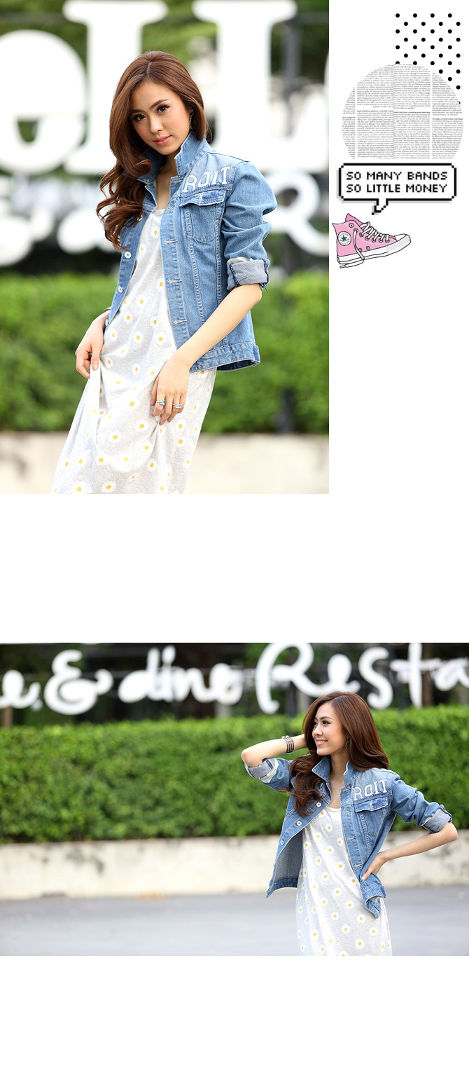 - แจ๊กเก็ตยีนส์ทรงสบาย เนื้อผ้ายีนส์หนากำลังดี ฟอกสีซีดสวยดูดีมีสไตล์ เพิ่มตัวอักษรเท่ห์ๆ ที่ช่วงตัว ดูดีมีราคามากมาย แถมแมทช์กับเดรส หรือ เสื้อยืดก็เก๋ไก๋มากมายเลยนะคะ แนะนำเพิ่มเติมสำหรับสาวๆ ที่ชอบลุกส์เซเลป ลองแมทช์กับ รายการ ST429/ DS703
