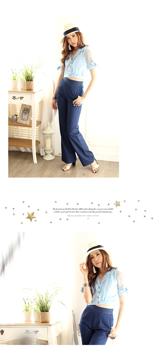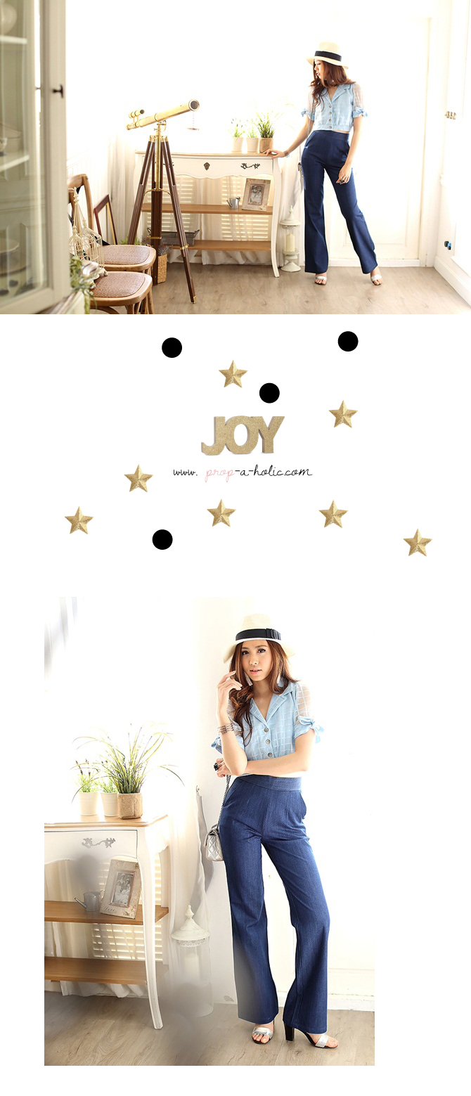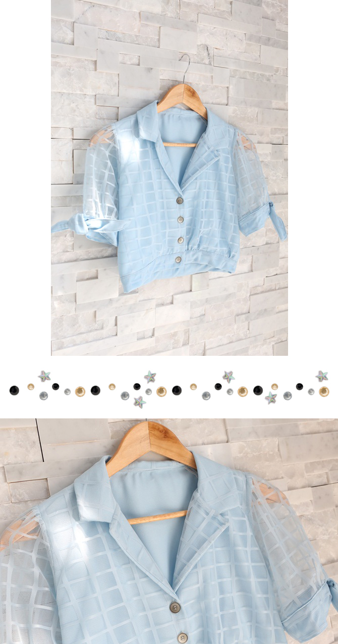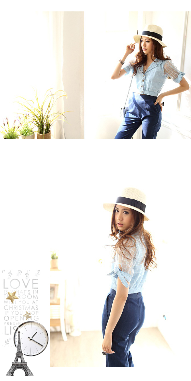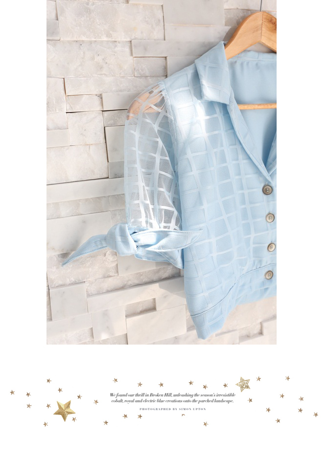 เสื้อเชิ๊ตคร๊อป ดีไซน์หวานซ่อนเปรี้ยว สีฟ้าสวยสะดุดตา มาพร้อมโบว์ที่ช่วงปลายแขนที่ผูกได้หลากหลายแบบตามใจชอบ สวยโดดเด่นด้วยผ้าตาข่ายตัดต่อซ้อนทับ ใส่คู่กับท่อนล่างได้มากมาย ทั้งกางเกง หรือ กระโปรง แต่ถ้าชอบลุกส์วินเทจ แนะนำจับคู่กับรายการ ST444 ได้ลุกส์ยุค 70 เริ่ดๆ ชิคๆ ค่ะ