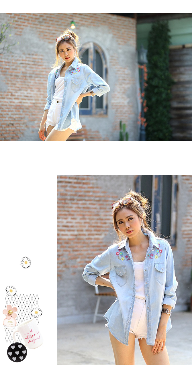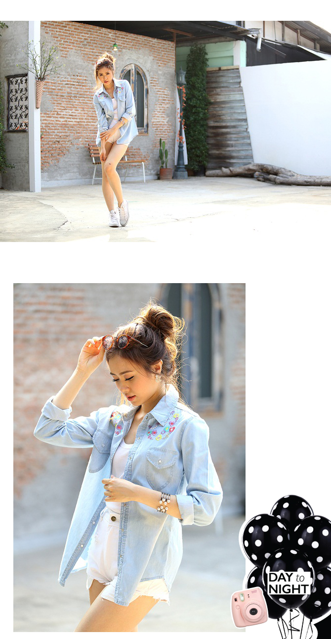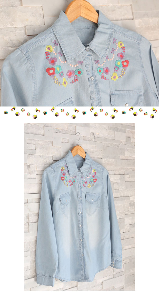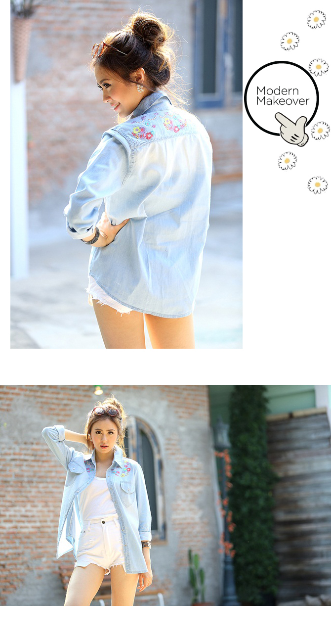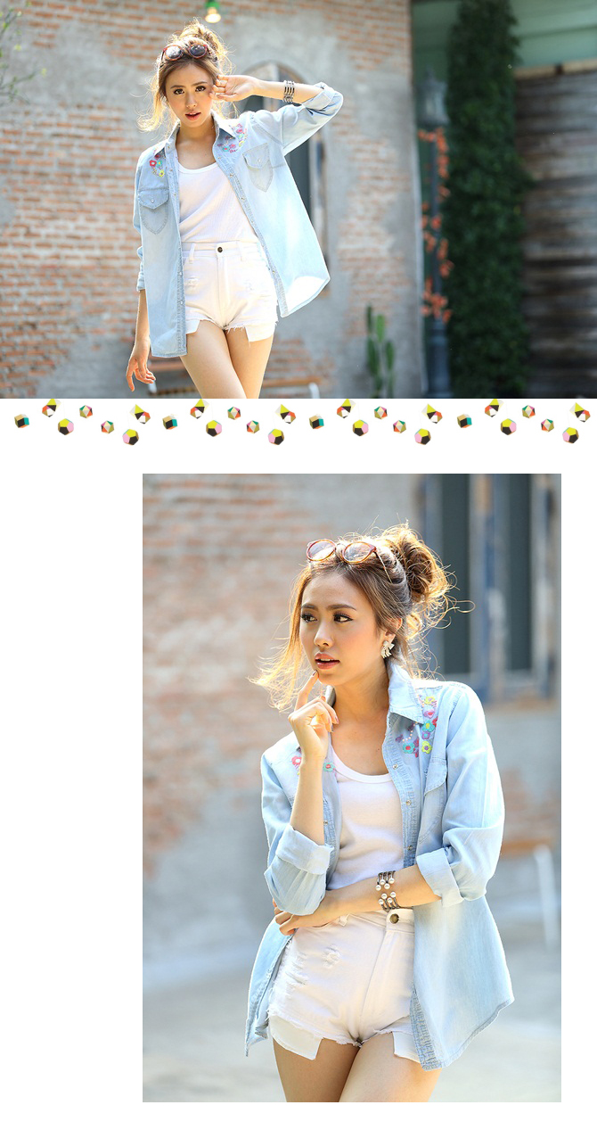 เสื้อเชิ้ตเนื้อยีนส์ ไอเท็มเด็ดที่ไม่เคยเอ้าท์ค่า ตัวนี้ฟอกสีอ่อนกำลังสวย มาพร้อมงานปักลายดอกไม้หวานๆ ให้ดูมีอะไรๆ แถมเข้าได้ง่ายกับกางเกง กระโปรงหลากหลายแนว