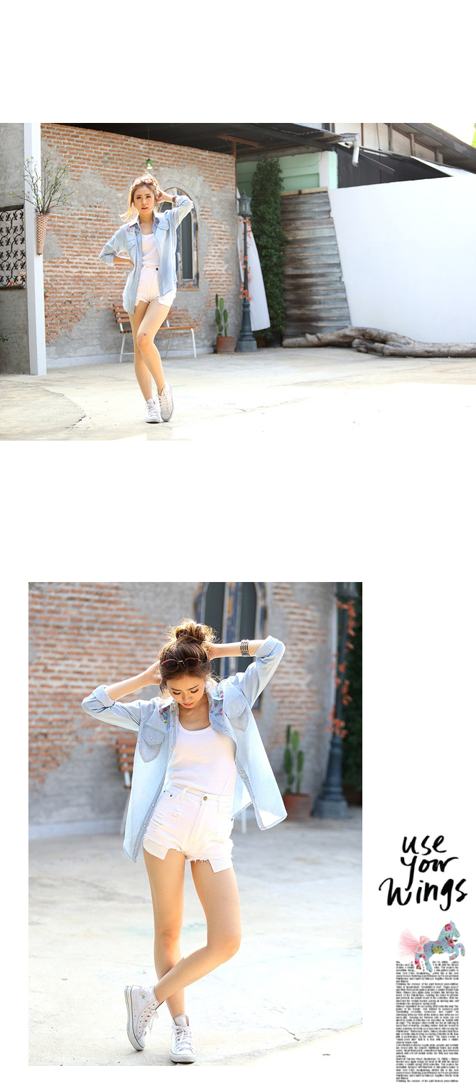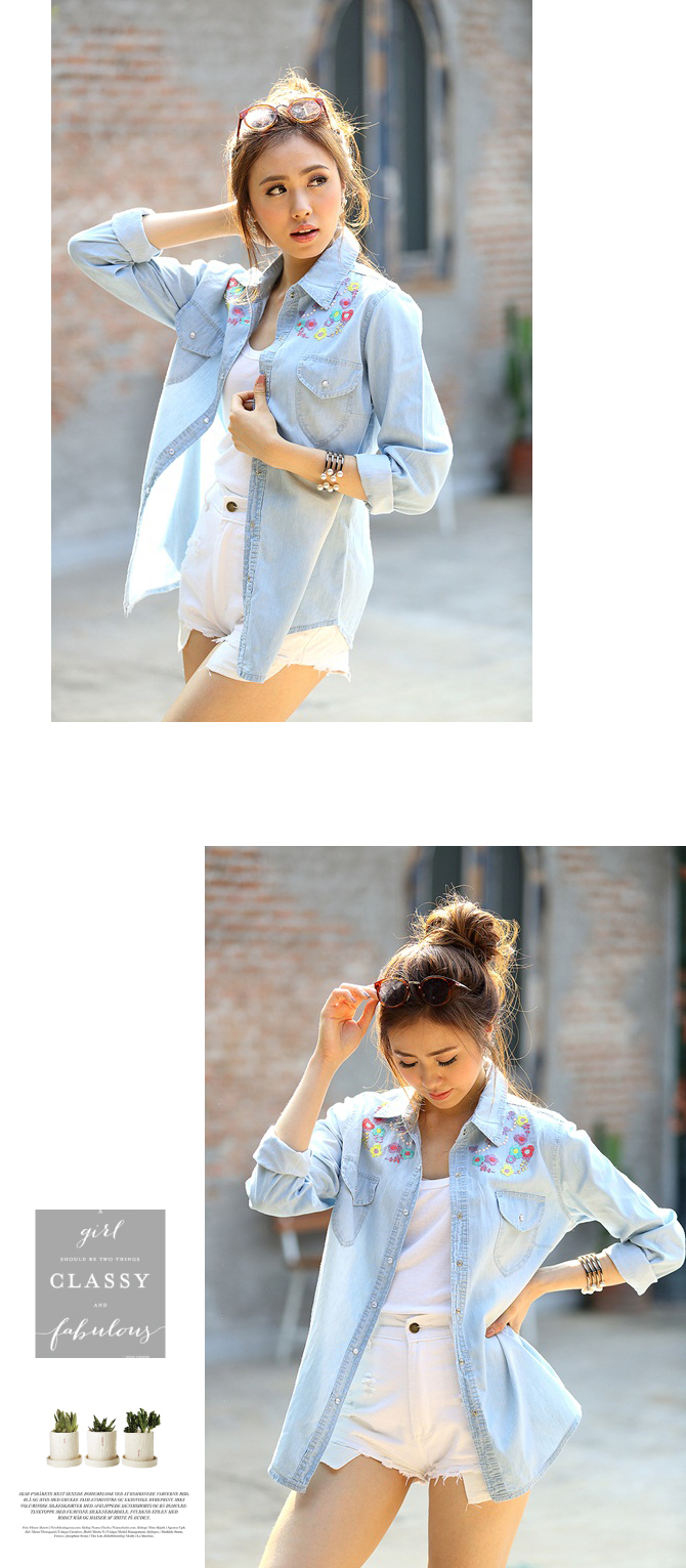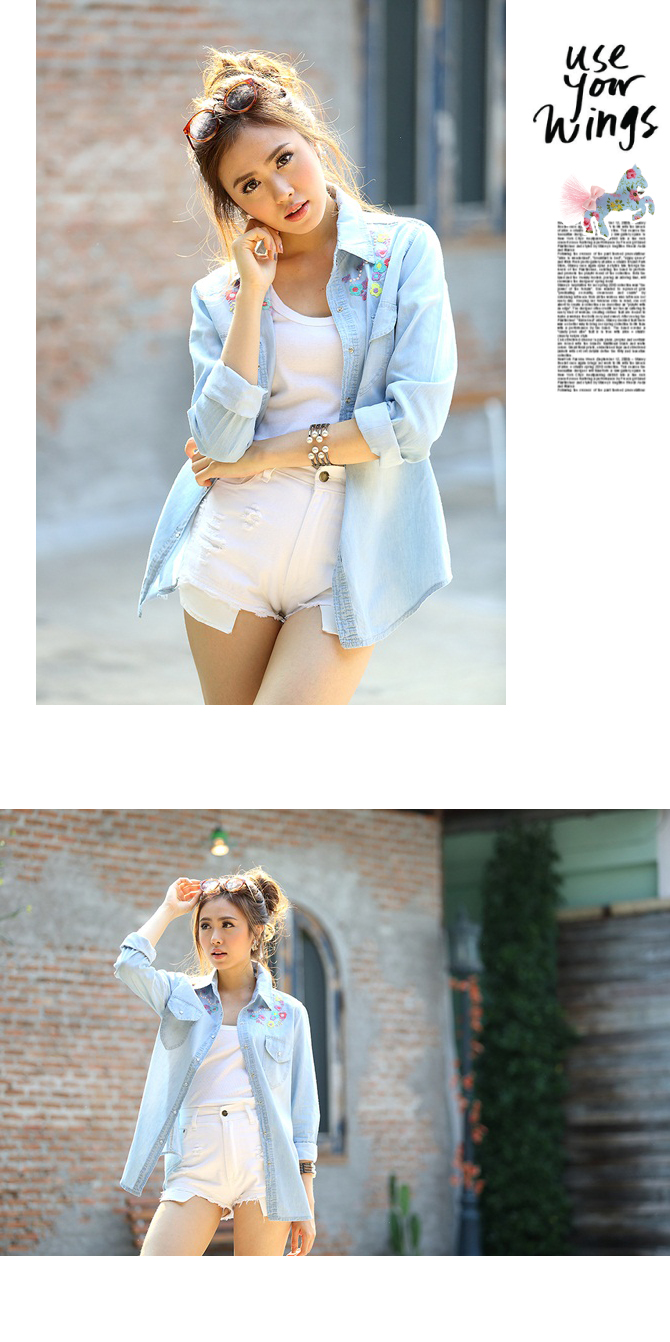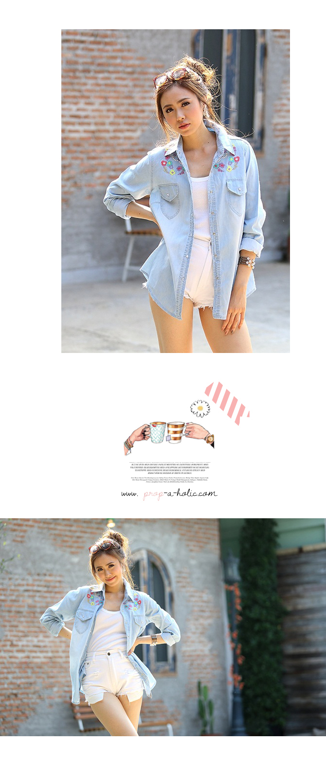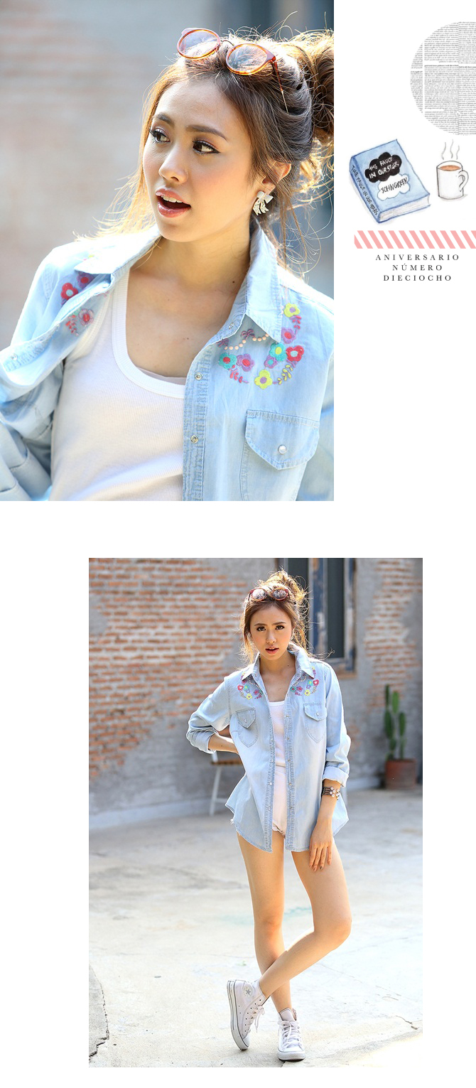 เสื้อเชิ้ตเนื้อยีนส์ ไอเท็มเด็ดที่ไม่เคยเอ้าท์ค่า ตัวนี้ฟอกสีอ่อนกำลังสวย มาพร้อมงานปักลายดอกไม้หวานๆ ให้ดูมีอะไรๆ แถมเข้าได้ง่ายกับกางเกง กระโปรงหลากหลายแนว