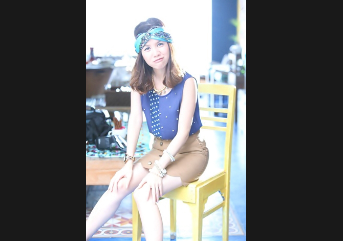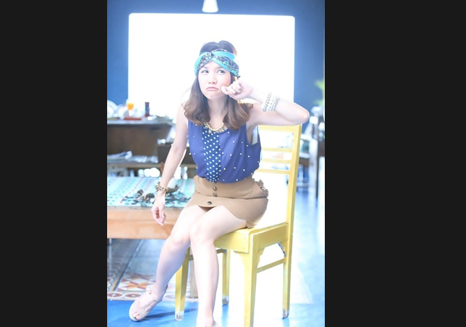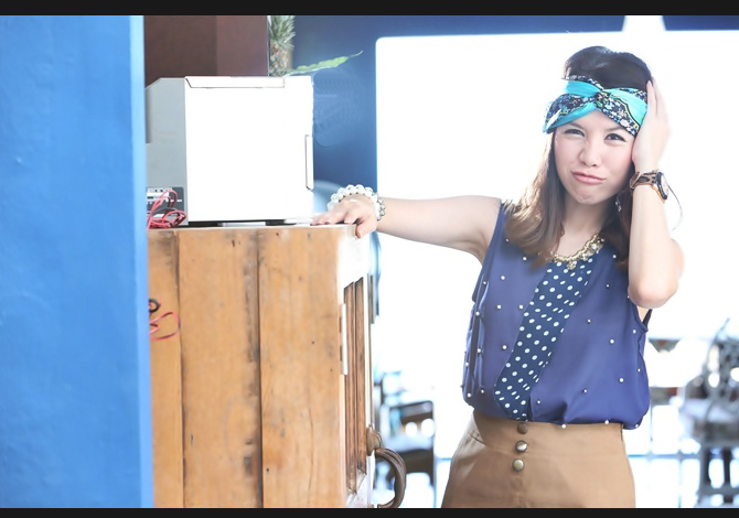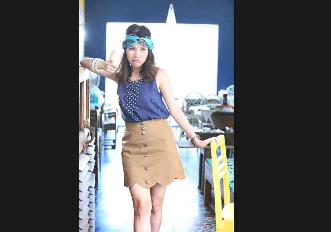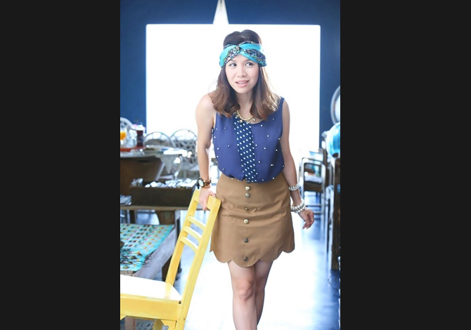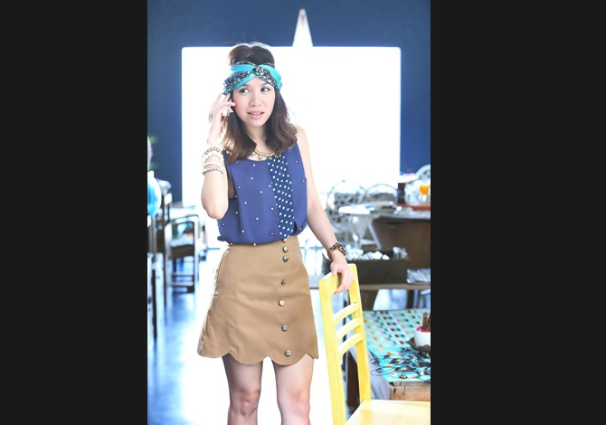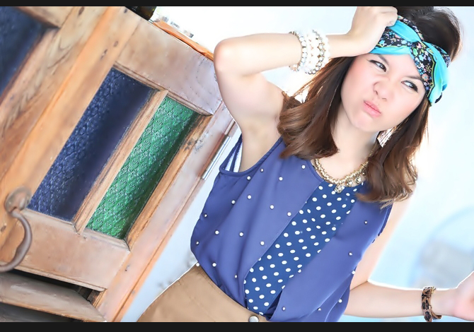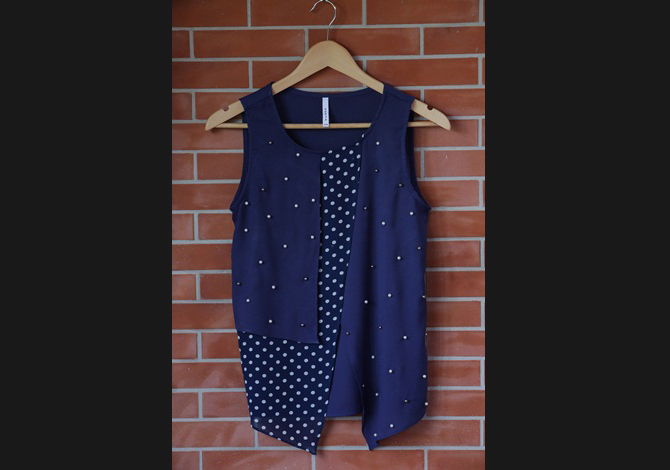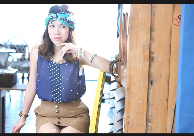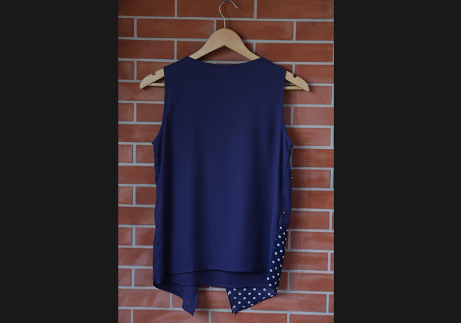 เสื้อทรงสวย คุณภาพเกาหลี ตัดต่อผ้าลายจุดสลับปักมุก สีน้ำเงินเรียบหรูค่า