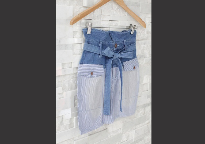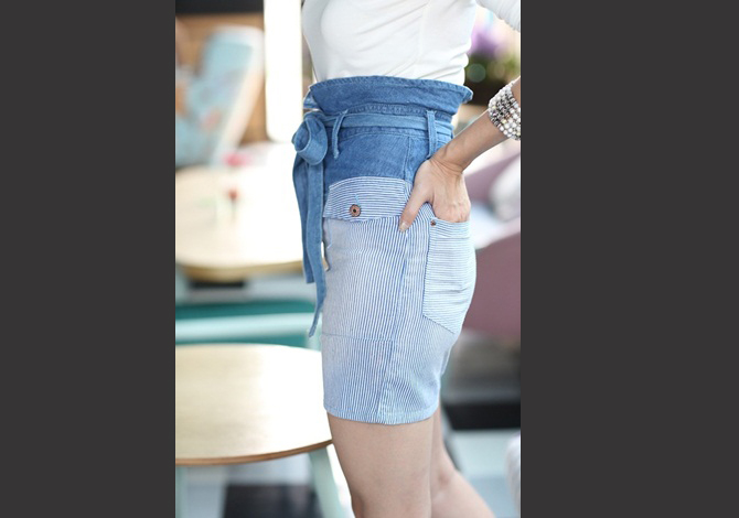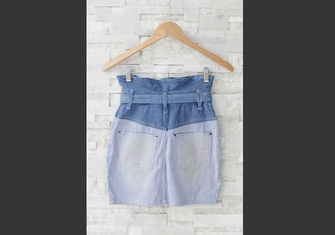 กระโปรงเอวสูงผ้ายีนส์ตัดต่อผ้าลายทางจาก Showroom ค่ะ ฟอกช่วงกระเป๋าแนวๆ มาพร้อมผ้าผูกเอวสวยงาม หมายเหตุ: ฟาใส่ S นะคะ