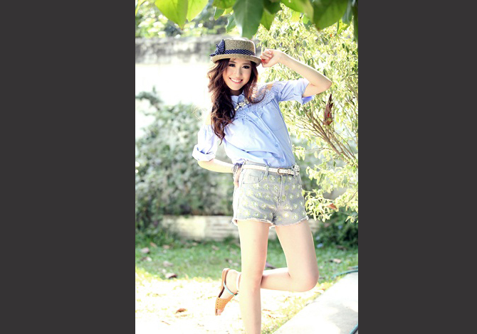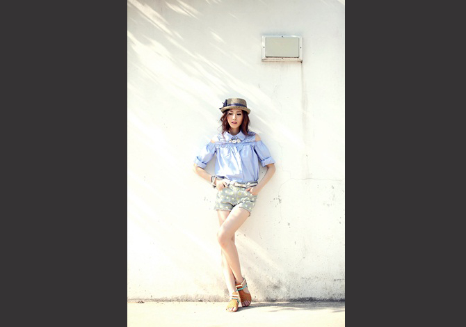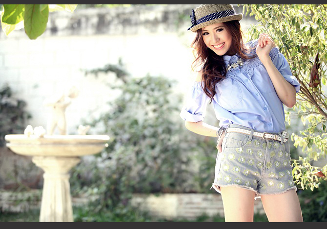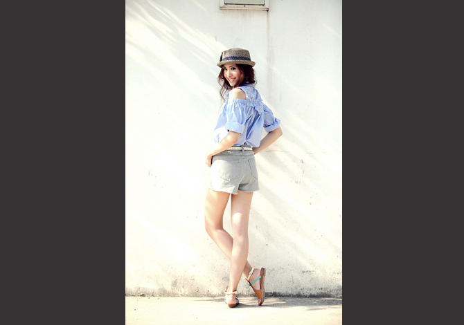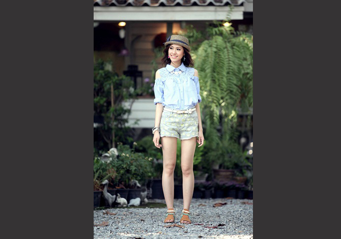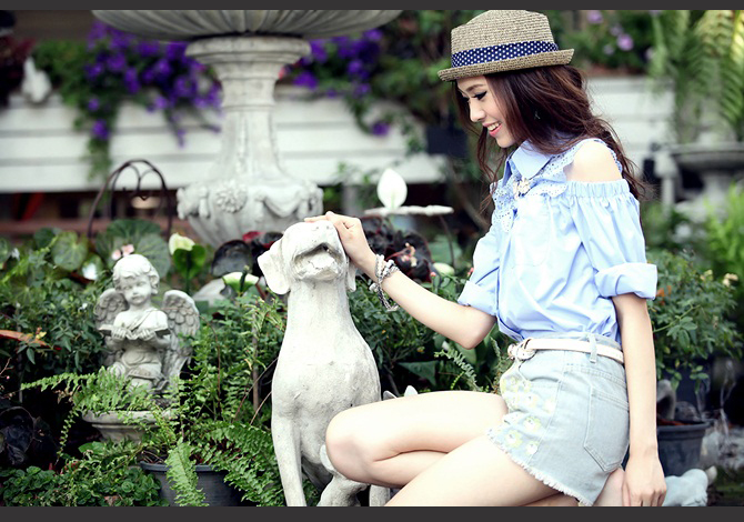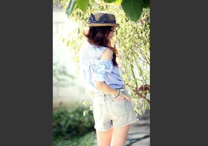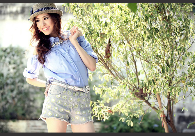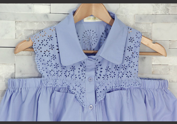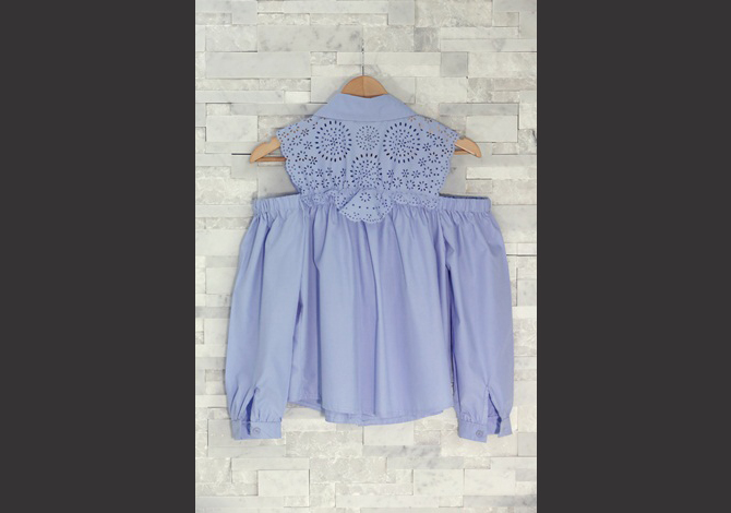 เสื้อเชิ๊ตเปิดไหล่ ดีเทลฉลุช่วงอกและหลังสวย งานเนี๊ยบ สีหวานน่ารักมากค่ะ